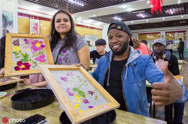 International student from the International Exchange College of Inner Mongolia Normal University (IMNU) learns the ancient art of papermaking with the help of a staff member at Damo cultural creative park in Yuquan district, Hohhot, the capital of North China's Inner Mongolia autonomous region on March 27.