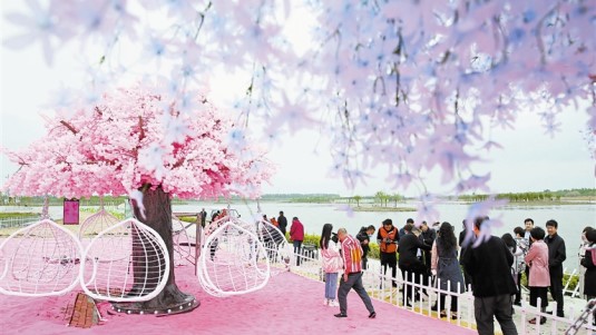 北辰区乡村振兴重点项目——曙光水镇首届田园乡村文化旅游节昨天开幕。民俗文化表演、百年牡丹展、樱花大道、萌宠乐园、夜景灯光秀等丰富多彩的文化旅游活动,吸引许多游客前来打卡。图为游客打卡粉红沙滩。作者/来源:高莹辉
