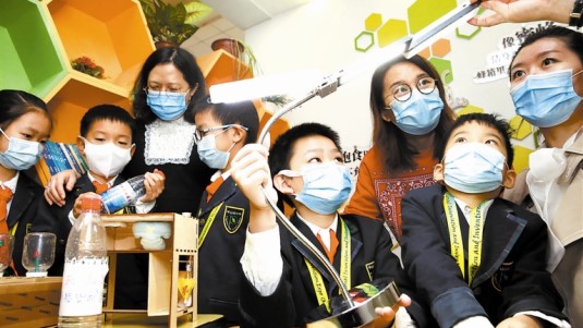 刚刚结束的澳门国际发明展中,平山道小学成为本市获得金奖人数最多的学校,有 5个项目获得国际金奖,图为获奖学生和指导老师交流心得。作者/来源:张立