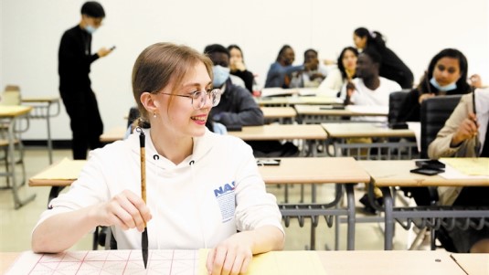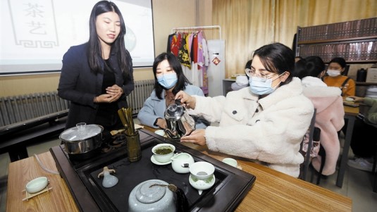 International students experience Chinese calligraphy and tea-tasting activities during a Chinese cultural festival sponsored by Tianjin Normal University. Creator/Source: Zhang Li