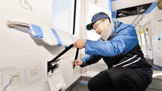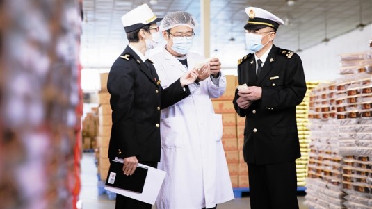 Customs officers from Hexi district make a trip to the time-honored homegrown enterprise Tianjin Guifaxiang Food Co to supervise its exported food, especially the dough twist, and help its journey abroad go smoothly. Creator/Source: Zhou Wei and Tong Jiangang