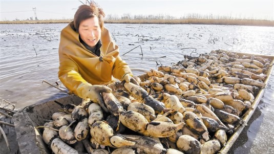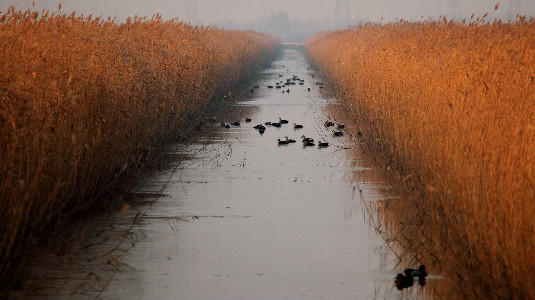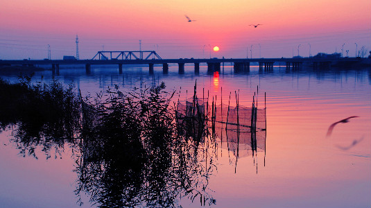 Flushed with the glow of sunset, the surface of Ji Canal is gleaming, attracting waterfowl to paddle in the river. Creator/Source: Ninghe District Cyberspace Administration