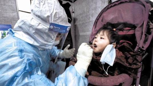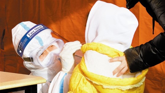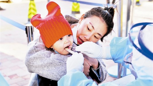 A 3-year-old child receives an acid test at a sampling point in the Tianjin Port Bonded Area. Creator/Source: Liu Naiwen