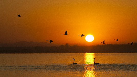 At dusk, white swans dance over the lake. Creator/Source: Jizhou District Cyberspace Administration