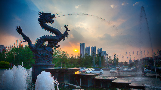 Under the light of the sunset, the dragon-like sculpture in the pool sprays the water to the sky, forming a halo which symbolizes auspiciousness. Creator/Source: Jinnan District Cyberspace Administration