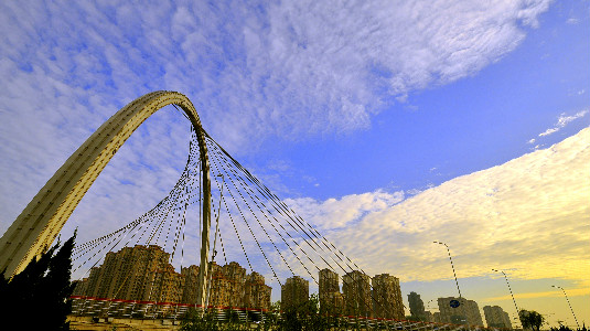 The blue sky is glittering and the clouds look like scattered cotton fibers. When looking up from beneath the large cable-stayed bridge, the steel cables seem majestic, as if they have lifted up a new city. Creator/Source: Jinnan District Cyberspace Administration