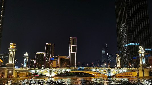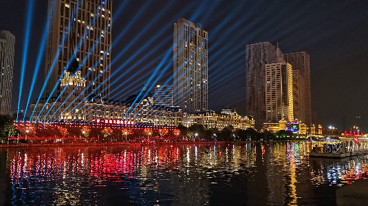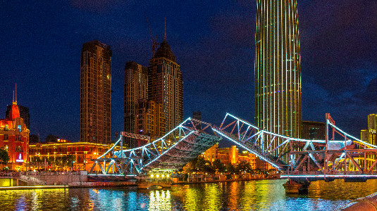 The "Rainbow Bridge" glows in gorgeous colors over the Haihe River when the night falls. Creator/Source: Jinnan District Cyberspace Administration