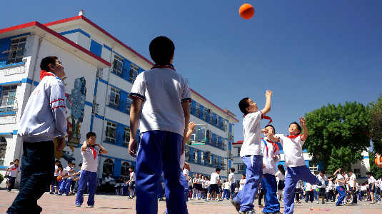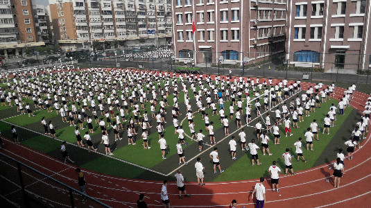 Students learn new exercises under the guidance of teachers in the new football field. Creator/Source: Hedong District Cyberspace Administration