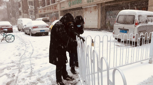The Hebei District Commission of Housing and Urban-Rural Development dispatched a team in the snow to build a temporary gate to guard a community. Creator/Source: Hebei District Cyberspace Administration