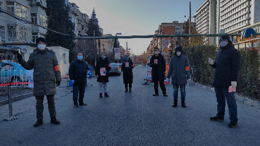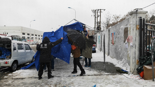 Temporary duty booths have been quickly set up at the gates of the communities and community-based work further strengthened. Workers are putting up a simple plastic tent in the snow with the help of the police. Creator/Source: Hebei District Cyberspace Administration