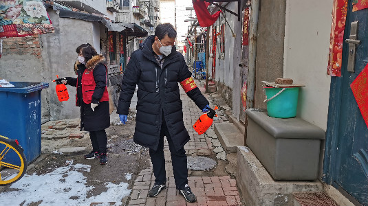 Early in the morning, community workers take sprayers filled with disinfectant to disinfect the community in a big way, especially the corridors and entrances in the buildings and other public places. Creator/Source: Hebei District Cyberspace Administration