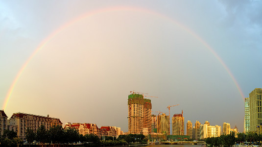 A rainbow appears in the sky over the tall buildings of Hebei district after the rain, forming a "bridge" which links the banks of the Haihe River. Creator/Source: Hebei District Cyberspace Administration