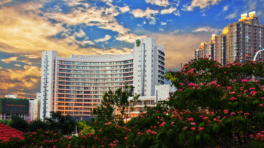 Albizia flowers are in full blossom and the sunset glow gilds the sky and building roofs with a golden color. Creator/Source: Hebei District Cyberspace Administration