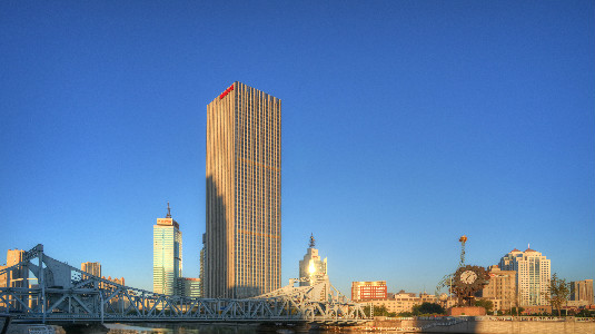 Guoyin Building (formerly Jindu Building) is a landmark A-level office building. Facing Tianjin Railway Station across a road and Quanyechang Business Area across the Haihe River, it is only 500 meters away from the Italian-style Street. Creator/Source: Hebei District Cyberspace Administration