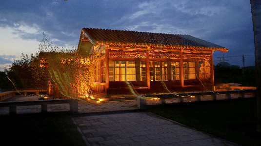 The ancient simple book house is brightly lit at night, providing a quiet place to enjoy reading. Creator/Source: Hebei District Cyberspace Administration