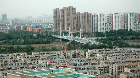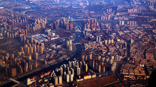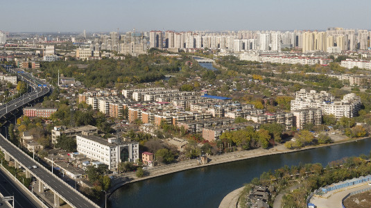 The color of the Hebei district, which is characterized by blocks of buildings with red roofs, seems to be stronger than others when overlooking Tianjin. Creator/Source: Hebei District Cyberspace Administration