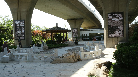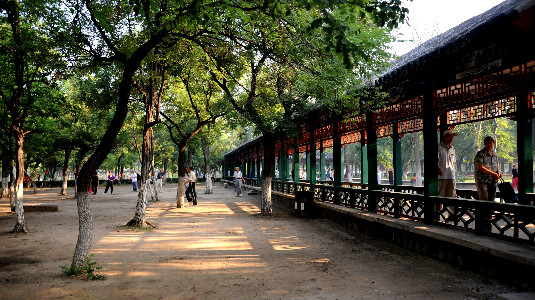 As the economy has developed, Tianjin citizens' living standards have been enhanced. The city is dotted with leisure parks. The photo shows the aged exercise and walk on the long corridor of a park. Creator/Source: Hebei District Cyberspace Administration