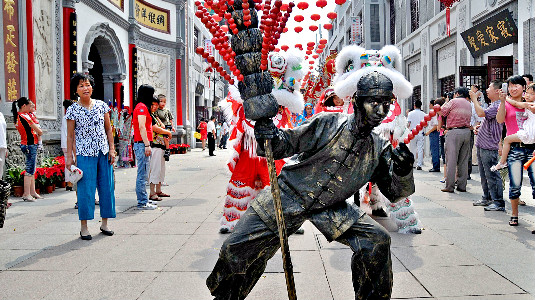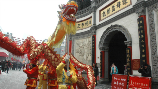 Performers undertake a dragon dance during the parade on the ancient street. Creator/Source: Hongqiao District Cyberspace Administration