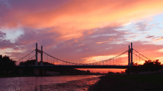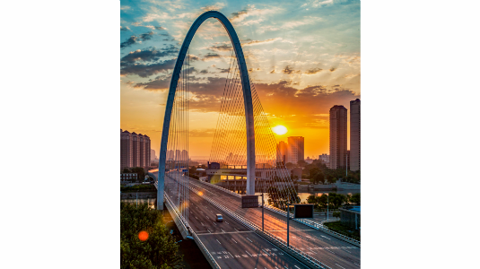 An arch bridge is flushed with the glow of sunset at twilight. Creator/Source: Hongqiao District Cyberspace Administration